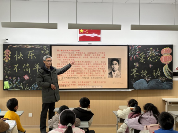 北郊高级中学退休教师陆锋走进位于江湾镇街道的红旗小学寒托班办班点,以古镇江湾的英雄故事为脉络,讲述了抗金名将韩世忠屯兵江湾;江湾人、甲午海战致远舰大副陈金揆以身殉国;“一·二八”淞沪抗战将士们坚守阵地浴血拼杀等故事。他告诉孩子们,脚下的这片热土,曾孕育出无数忠肝义胆的英雄儿女,每一寸土壤都镌刻着家国情怀。
