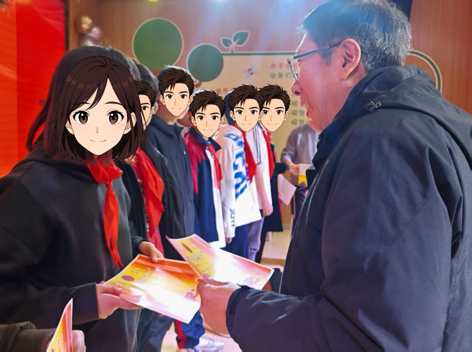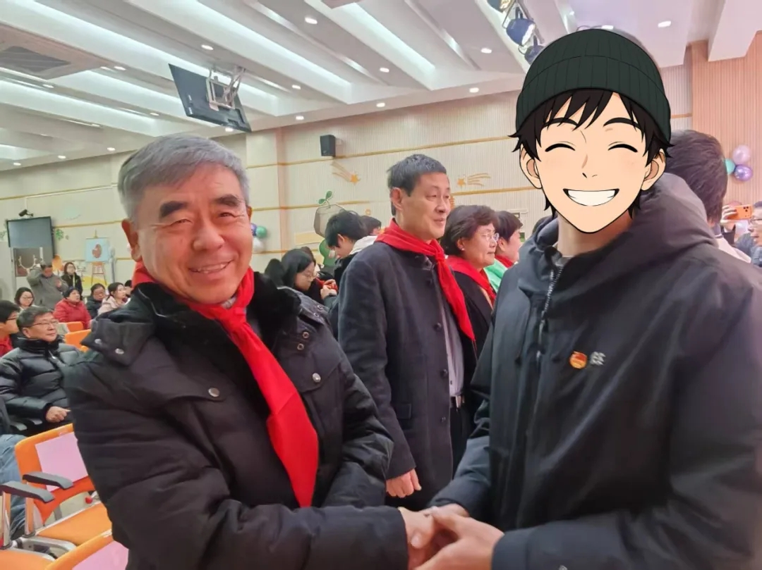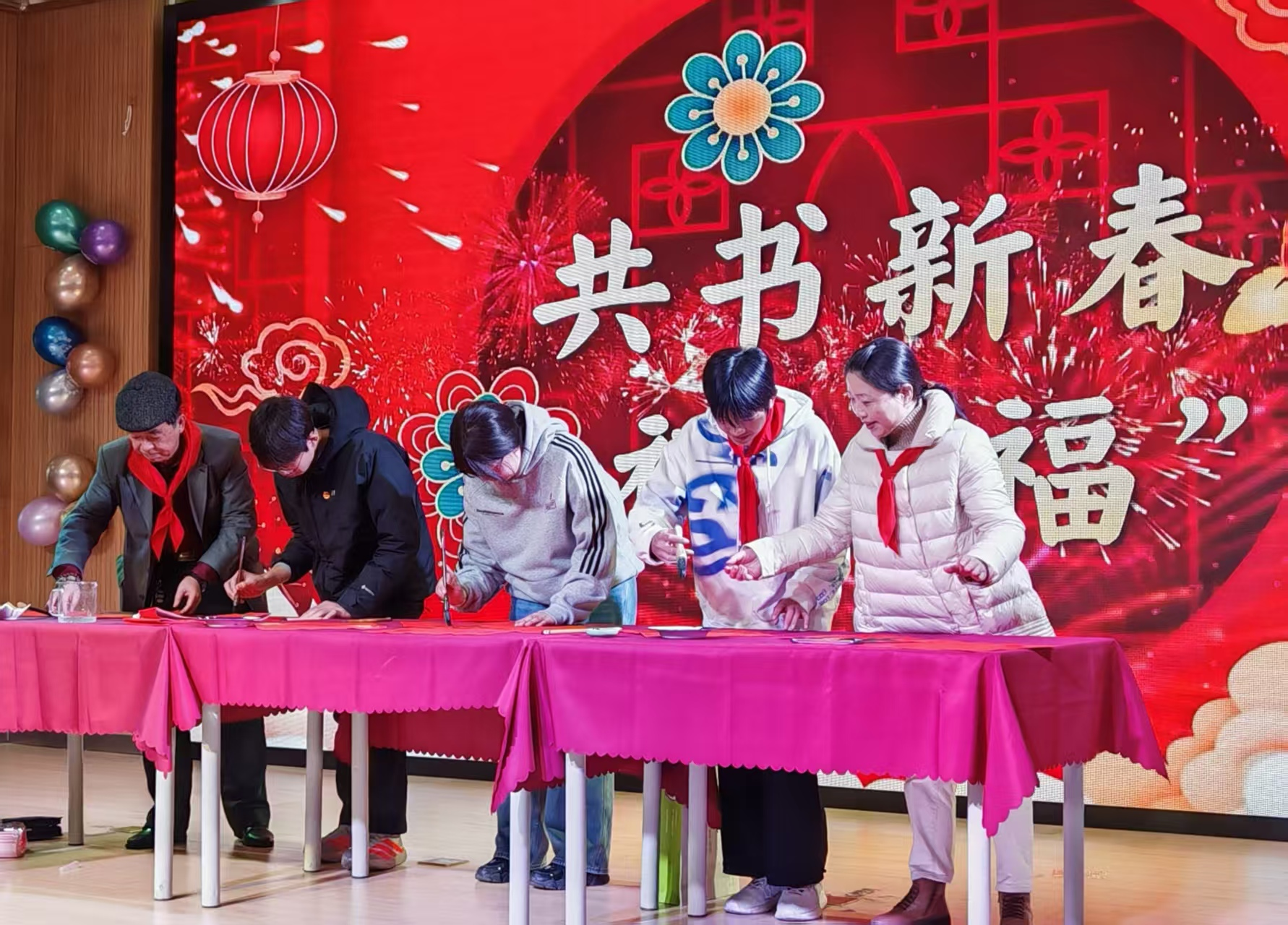 活动最后,“追光者的祝福”环节温情满满。“五老”志愿者王鹏、陆文焕、李慧等与学生们一同铺纸研墨,共书福字。老同志将现场创作的书画作品、春联等新年礼物赠予学校,向广大师生送上真诚祝福与美好希望。