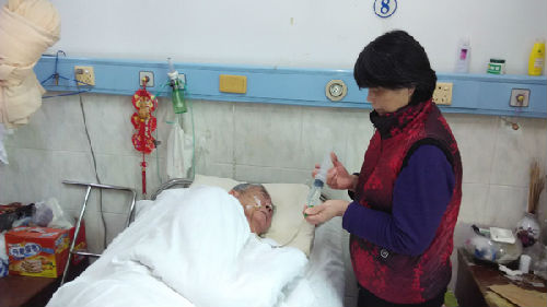 七年里,她日日夜夜陪伴在父亲的病床前,累了困了就趴在父亲的病床边休息一会,饿了就随便吃点,七年里没睡过一个安稳觉、没吃过一顿正常饭。父亲瘫在床上,没有意识,她喂药喂水喂流食,端屎端尿,定时给父亲翻身、擦身、按摩,以防止由于长期卧床长褥疮。这期间,也请过几个护工,但由于伺候这样的病人又脏又累,大多做了时间不长就不肯做,所以护工是不停的换,唯有她不怕累不怕脏、不离不弃、无微不至地照顾着父亲。