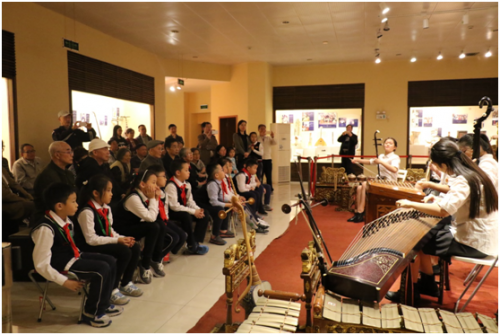 活动伊始,由建襄小学三年级的小小志愿讲解员为老同志介绍博物馆馆藏精品曾侯乙编钟、甘美兰等,上海音乐学院的老师带来编钟演奏,老同志们听得津津有味,时时传来赞扬。随后,由来自上海音乐学院附中和附小的同学为老同志合奏江南丝竹五重奏,并带来古筝、琵琶、柳琴、扬琴等独奏。乐曲时而悠扬委婉、时而欢快跳跃,精彩的表演引来阵阵掌声,老同志们纷纷表示意犹未尽,深刻感受到音乐无尽的魅力,活动现场其乐融融。