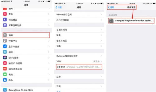 安装APP后,依次进入:设置-通用-设备管理中,点击信任Shanghai Flaginfo…… (如下图),方可正常使用。