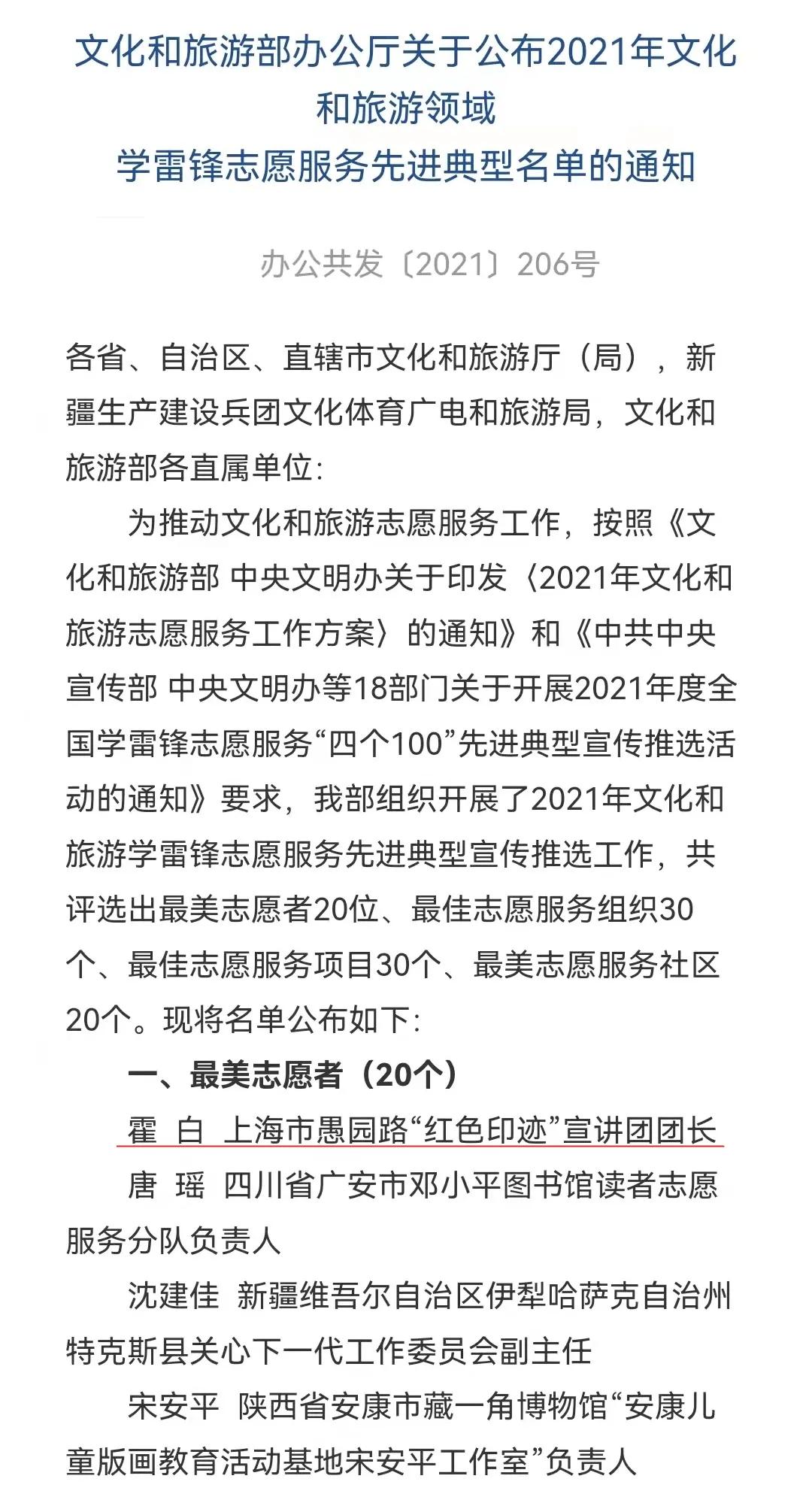 2021年文化和旅游领域学雷锋志愿服务先进典型名单日前公布。共评选出最美志愿者20位、最佳志愿服务组织30个、最佳志愿服务项目30个、最美志愿服务社区20个。长宁区愚园路“红色印迹”宣讲团团长霍白入选全国“最美志愿者”。今天,就让我们一起来了解霍白的故事……
